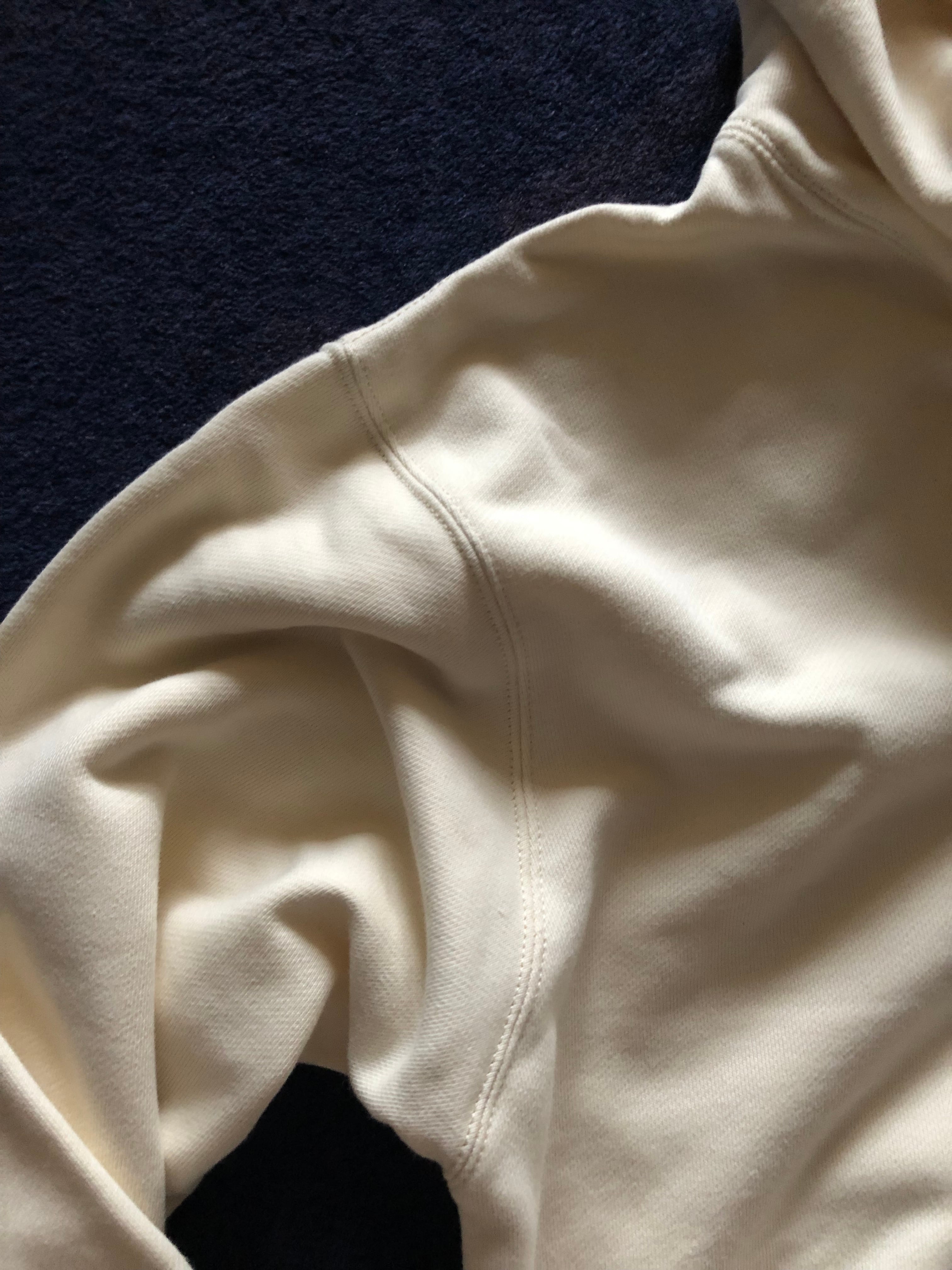 アーバンテイストでデイリーに着回しができる、ややざっくりなシルエットが特徴です。生地感はふっくら、裏糸のパイルは通常よりも太い糸を編み込み重厚感ある生地でどこかクラシックな佇まいも◎。また、洗濯後の縮率を軽減させるため、生地水洗いとタンブル乾燥を製造行程で施した「プリシュランクファブリック」を採用。アームホールや袖口など、力が加わる部分のステッチワークは太番手の縫製糸と粗めの運針数でダブルステッチにすることで、堅牢さと立体感を実現しました。